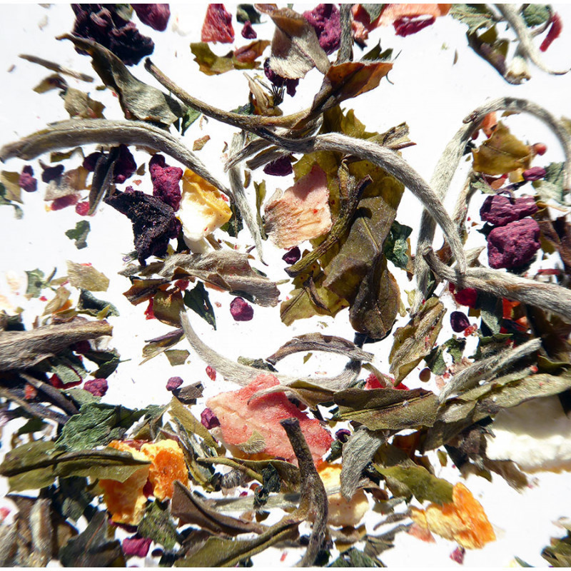 Fabulous Fruity White Tea. Completely natural, rich in Antioxidants, Vitamins and Mineral Salts. Fully reflects the flavors of the Italian Summer. Great hot or cold.