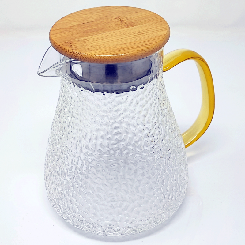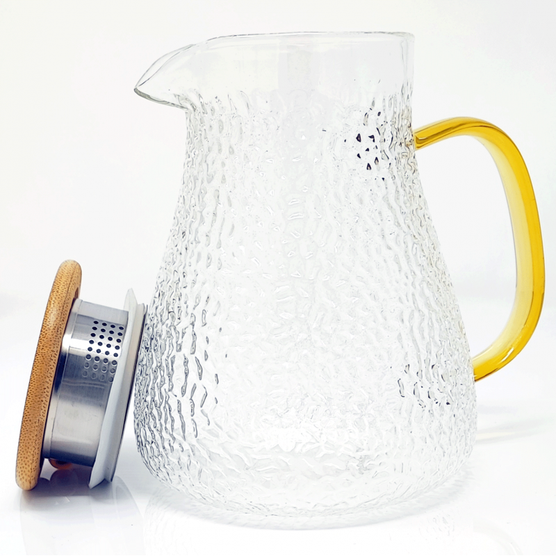 Mouth-blown borosilicate glass carafe with embossed pattern with wood & steel lid. It can be used for both hot and cold teas. The internal filter under the lid also allows it to be used as a teapot for loose tea.