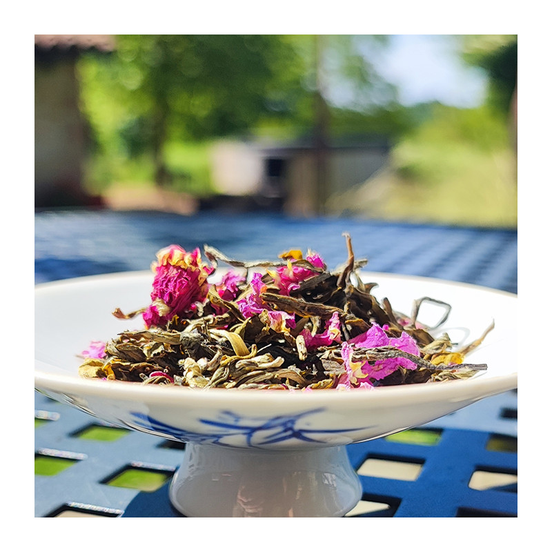 Jasmine Rose is the perfect combination of our Mao Feng Green Tea with Jasmine and Damask Rose from the Ligurian hinterland. The result is a very high-quality tea that is delicate and floral; delicacy is its defining characteristic, with no added flavoring. Try it also cold on a hot summer day! 50-100-250g pack.