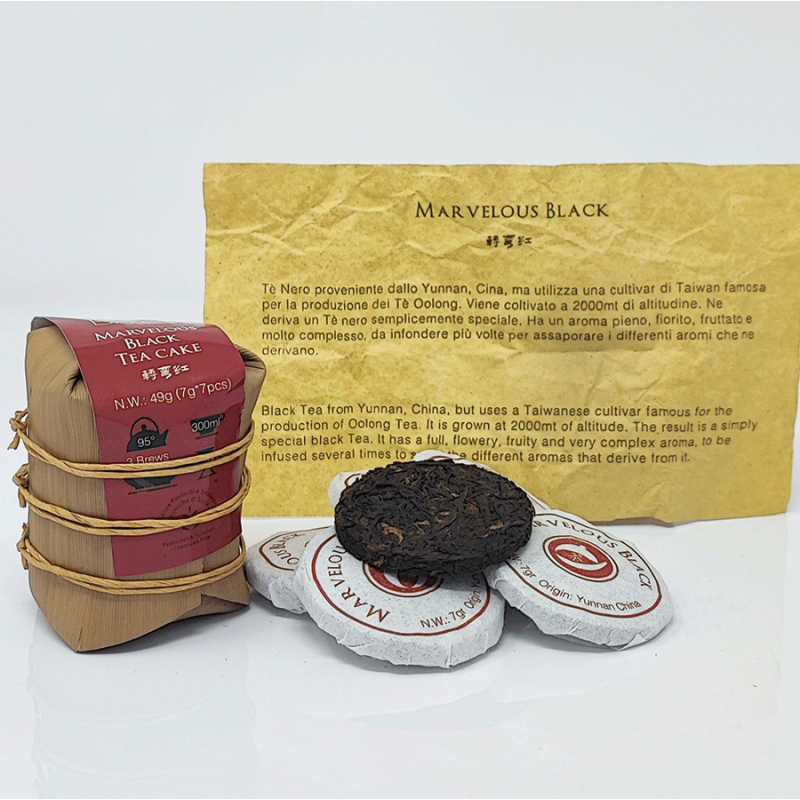 Fabulous Black Tea from Yunnan, China but uses a Taiwanese cultivar famous for the production of Oolong Teas. The result is simply a special Black Tea. It has a full fruity and very complex flowery aroma, to be infused several times to savor the different aromas that derive from it. A must try, for connoisseurs.Pack of 7 Mini Tea Cakes of 7gr each: 49gr.