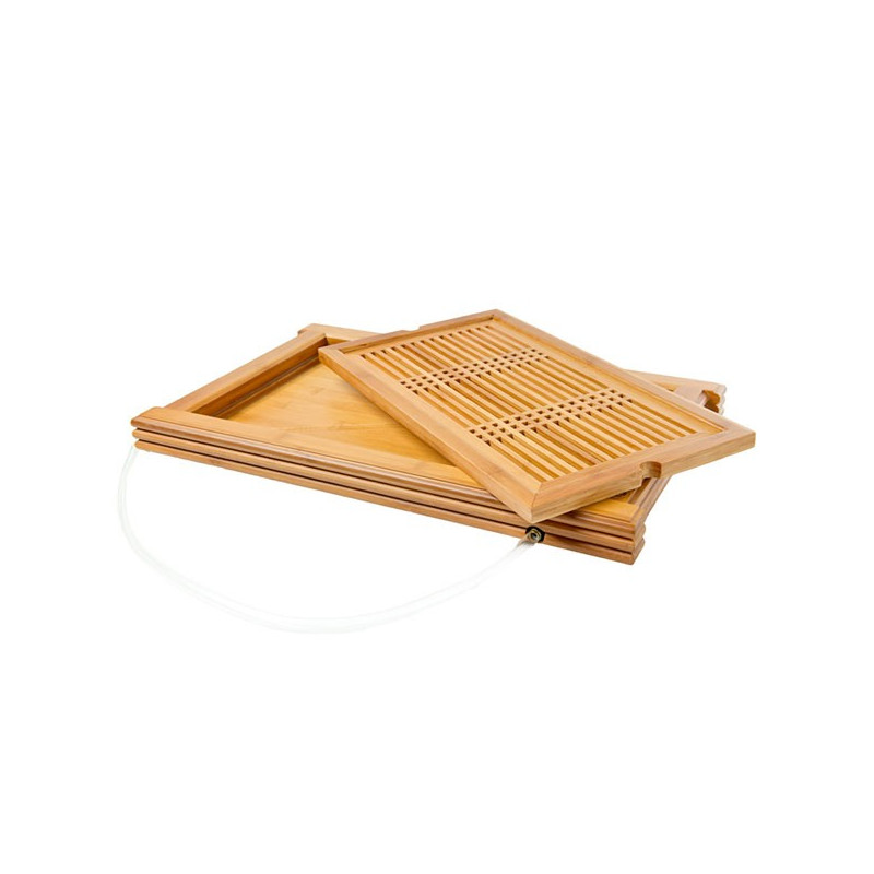 In China, the Tea ceremony (Gong Fu Cha) is carried out using tables with the aim of collecting the water and Tea that are produced during the preparation of the Tea. These tables can be of various shapes and materials. Some of these tables collect the water inside them and should be emptied regularly, others have a drainage tube which carries the water outside, to containers such as vases made of porcelain or other materials.