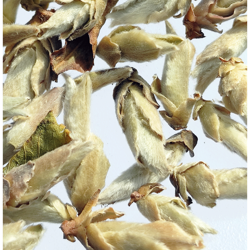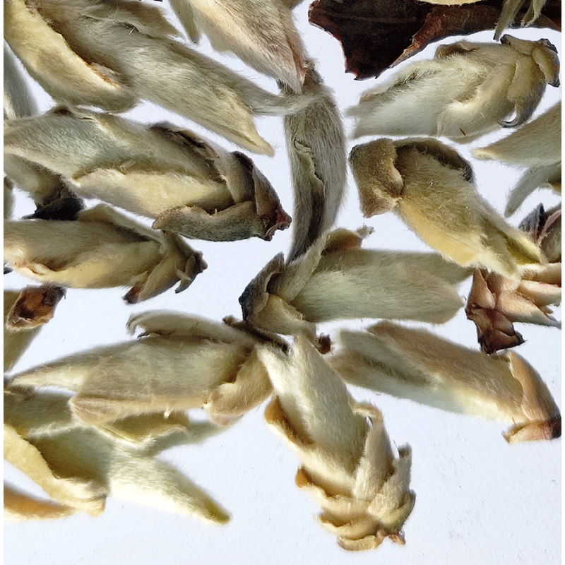 Very delicate White Puerh Tea from the Nature Reserve of Mount Ailao in Yunnan. In these forests live the oldest Tea trees in the world. It is simply harvested by hand from wild trees exclusively by neighboring villagers, the only ones to have permission to harvest. The variety of Camellia is the Assamic variety native to these forests, the same one that is used for the production of classic Puerh Tea. At the end of winter at an altitude of over 2000 meters, only the shoots still to be opened, without the leaves are collected. This is the first Tea to be harvested in China and for this reason it is also called "spring messenger". After harvesting the tender shoots are made to wither in the sun for a few hours, then they are left to dry away from light at room temperature. That is why it has a very low oxidative level and maintains the organoleptic properties and antioxidants of which it is very rich. At the end of the processing the shoots are completely covered with a thick clear and soft fluff.